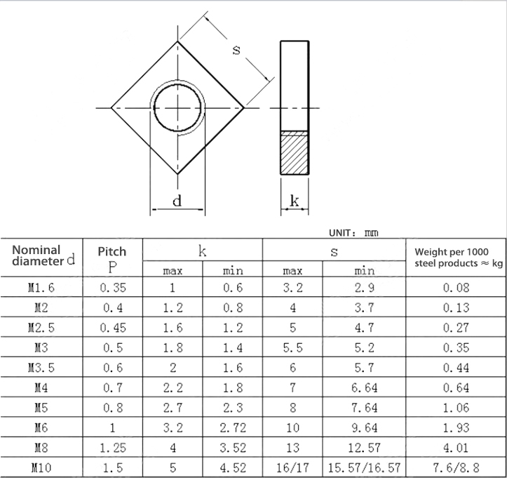 स्क्वायर नट एक प्रकार का धातु फास्टनर है जिसमें एक वर्ग बाहर और बीच में छोटे गोल छेद होता है। इसका उपयोग यांत्रिक घटकों को जोड़ने और ठीक करने के लिए किया जाता है, जो आमतौर पर बोल्ट के साथ मेल खाते हैं। अन्य नट्स की तुलना में, स्क्वायर नट में स्थापना के लिए एक बड़ी सतह होती है, जो ढीले होने की घटना से बच सकती है और संयुक्त की विश्वसनीयता और स्थिरता को बढ़ा सकती है। स्क्वायर नट का उपयोग आमतौर पर भवन, मशीन निर्माण और ऑटोमोबाइल क्षेत्र में किया जाता है।